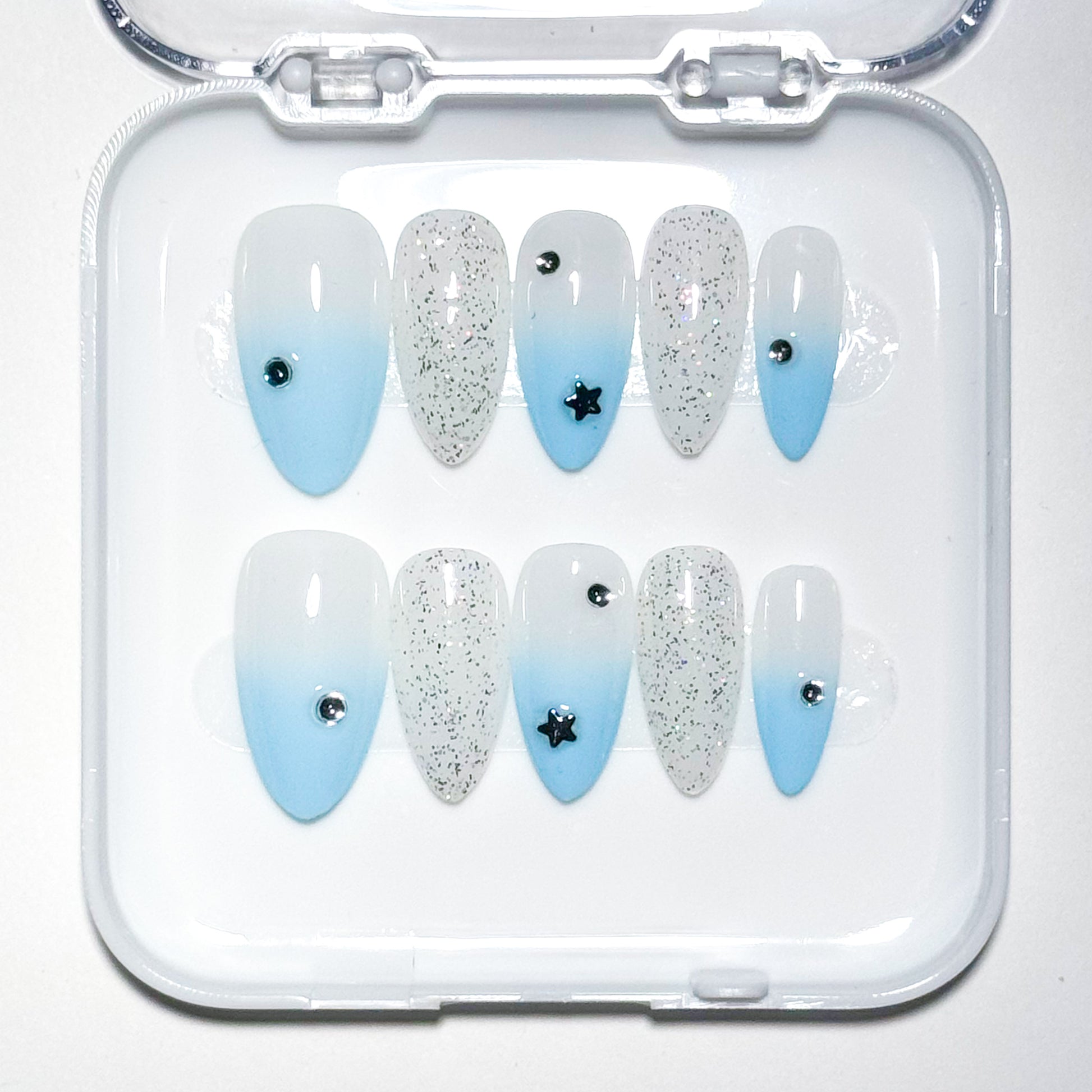 This press-on nail set features a soft blue ombré with delicate sparkle accents and tiny star details for a dreamy celestial finish. Perfect for anyone who loves simple, elegant nail art with a subtle magical touch.
